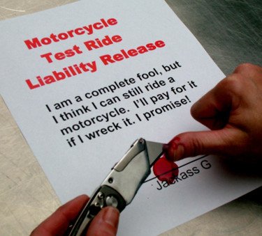 - Get ready to sign a "Rider Release" document that makes you fully responsible for EVERYTHING. By the time you're done reading the rider liability release, be geared up to sign it in blood. If you crash and burn and are maimed for life, no matter what the reason, you'll be buying the bike and all of your hospital bills. If you manage to kill yourself on your test jaunt, you'll be signing away any rights your heirs may have to sue the dealership too for your mishap. Without a doubt, be totally prepared to sign a legal binding document that is written in legal-ease that you're a complete and utter fool to want to attempt to participate in such a dangerous activity such as riding a motorcycle. Sounds like fun, huh?