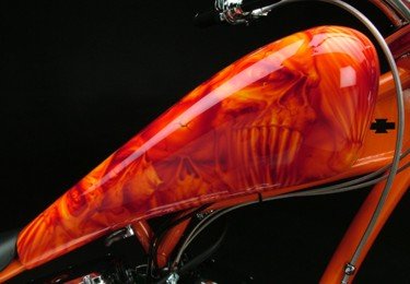 One of the artists we use to paint photo realistic portraits for our projects told me about a job he did. His customer commissioned him to paint women all over his bike with anatomically correct hygienically coiffed reproductive organs exposed. The first time this guy proudly parked his bike out in public, he was immediately cited by a police officer for obscenity. He wound up with black electrical tape strategically placed all over his new "personalized" paint-job so the cop would let him ride it home. Was it a personal artistic expression of his favorite pastime, or was he a gynecologist, I don't know? Regardless, it's important to remember that the images you put out for the world to see in public do carry some level of accountability. What you have painted on your bike reflects an image to the public, making a statement about who you are personally. This can be a lot of responsibility choosing what to paint on your metal canvas. It's important to take the time to think the whole process all the way through, visualizing what the feeling and reaction could be like when others are admiring your rolling work of art.
